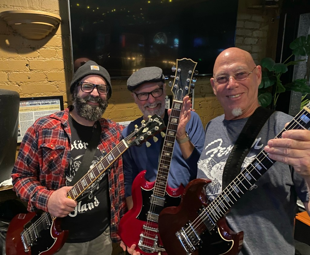 SG stands for so good! Three caballeros showed up unplanned with the same type of guitar. Spot the pseudo-Gibson…