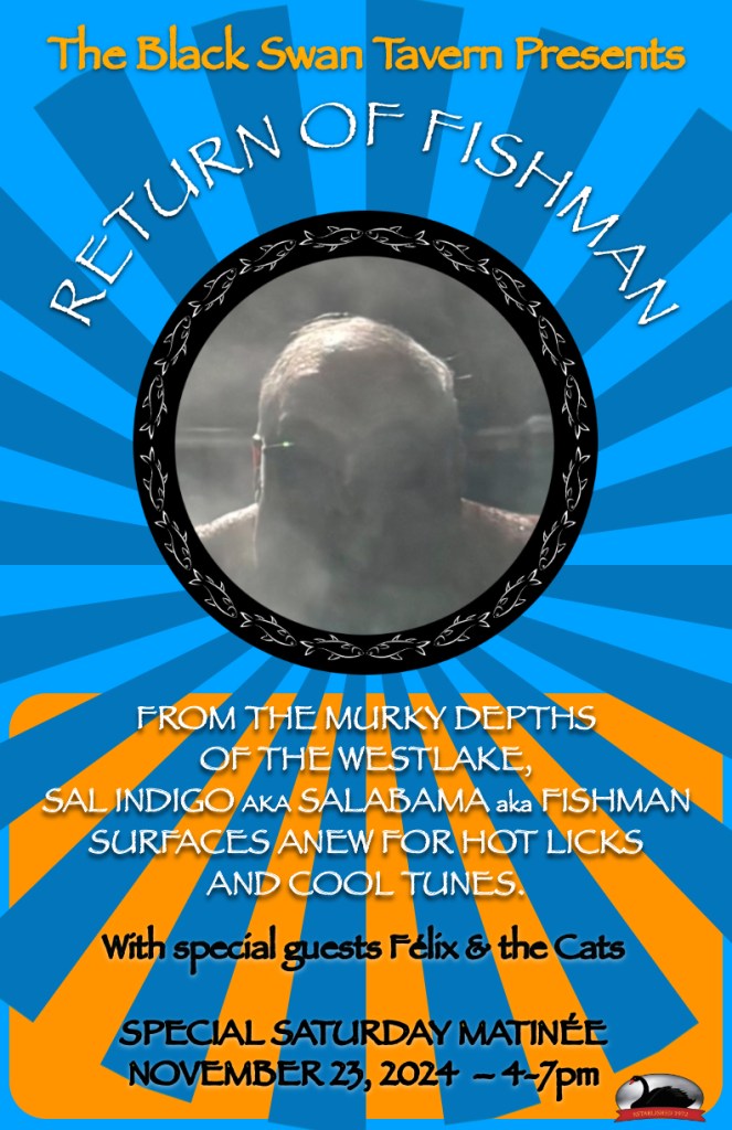Gigs are intermittent, a tribute to the challenge of performing all-original material, but thankfully, a tight network of mutually supportive musicians helps when possible. One such occasion is this Saturday, November 23 at the Black Swan Tavern on Danforth. The Cats have played there many times and it’s always a great venue. We’re opening for Sal Indigo aka Salabama aka Fishman with special guest Bruce Moore subbing on bass as NeMo is out of town with Reggadiction. I would not be surprised if others grace the stage as well. You’ll just have to come down to find out!